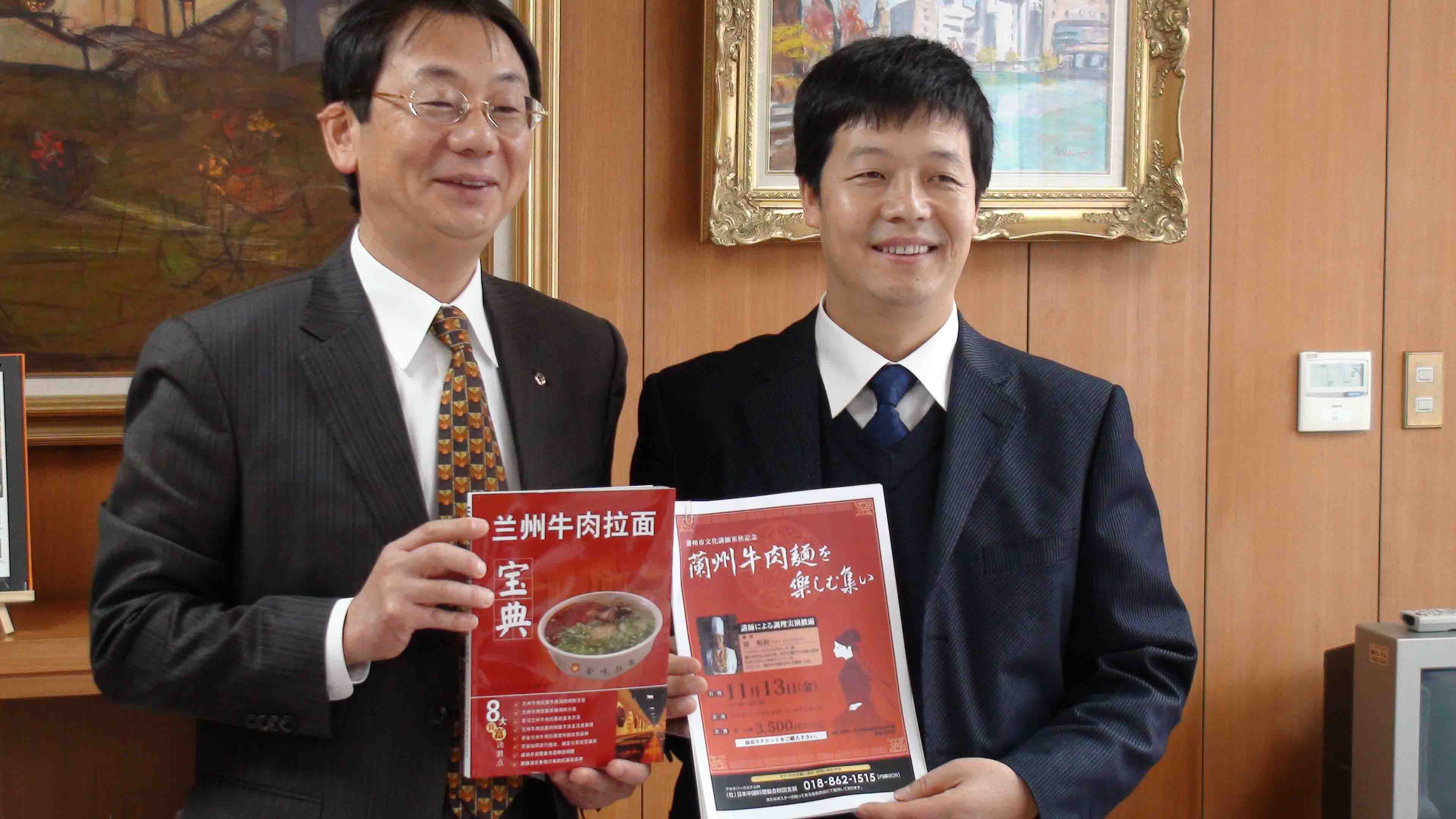 文化讲师梁顺俭将自己编著的兰州牛肉拉面宝典一书赠给日本秋市长穗積志先生