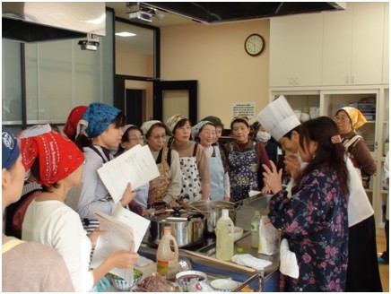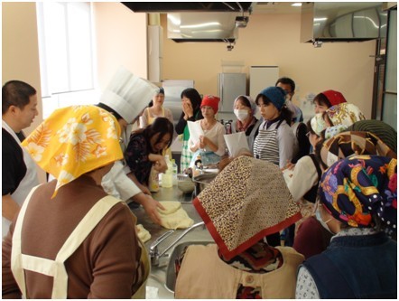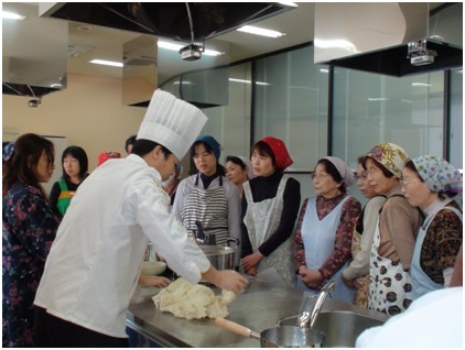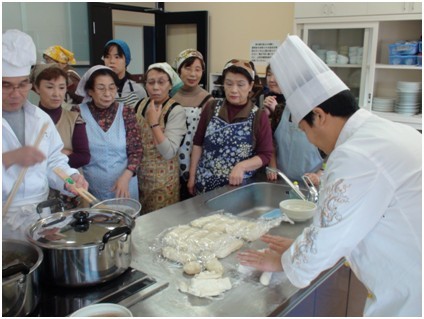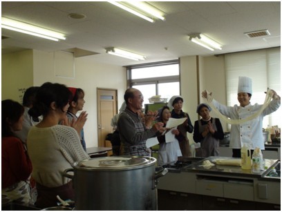 甘肃金味餐饮有限公司总经理、兰州市烹饪技术协会副会长梁顺俭先生向日本秋田市民传授兰州拉面文化。