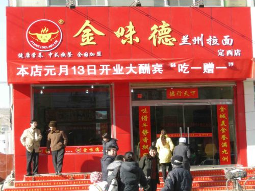 面面彩旗迎嘉客 爆竹声声道吉祥, 2010年1月13日,“金味德”兰州拉面定西店隆重开业了!甘肃金味餐饮有限公司总经理梁顺俭先生参加了开业典礼并就金味德拉面向大家做了详细的介绍。金味德拉面不仅继承了传统兰州拉面的特色,而且开发出了适合现代人营养要求的蔬菜营养拉面系列。其中包括绿色营养蔬菜拉面,南瓜营养蔬菜拉面等,现在已成为传统兰州拉面行当中的新秀,获得顾客的一致认可和好评!