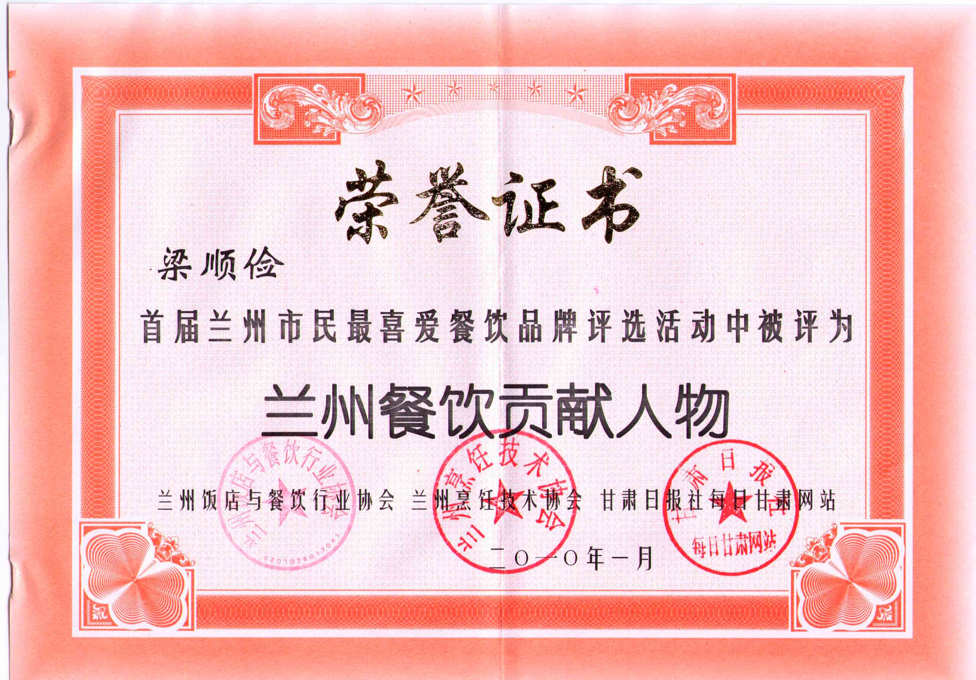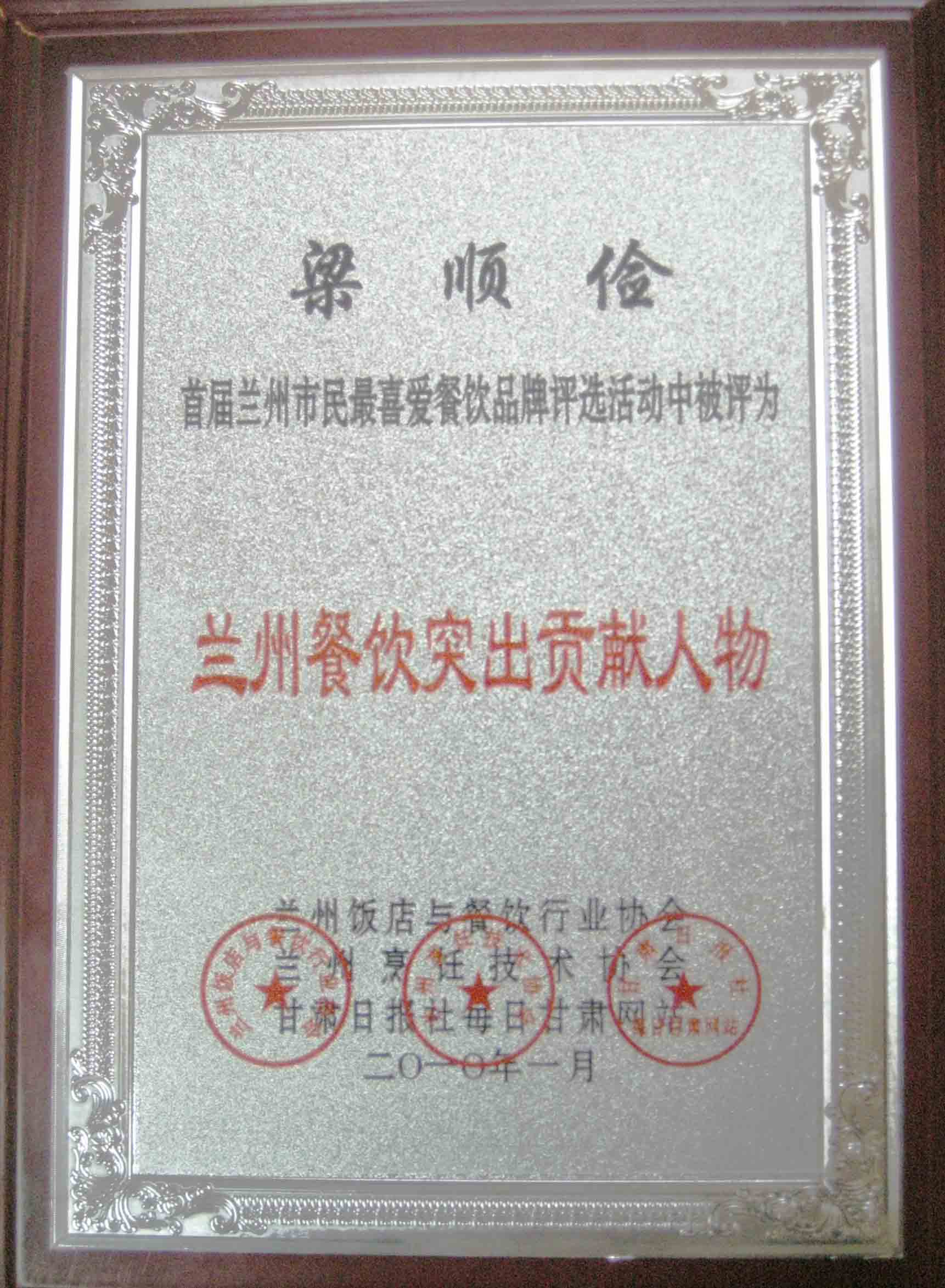 2010年1月28日,由兰州饭店与餐饮行业协会、兰州烹饪技术协会、甘肃日报社每日甘肃网联合主办的“首届兰州市民最喜爱餐饮品牌”评选系列活动圆满落下帷幕。甘肃金味餐饮有限公司总经理梁顺俭被评为了兰州餐饮贡献人物。对于梁顺俭先生来说,这个奖项不同于以往的奖项,这是兰州市民对梁顺俭先生这些年来为了发扬兰州传统特色美食牛肉拉面所付出努力的最大肯定。梁顺俭先生说,这是他二十多年厨艺生涯中最具有特殊意义的一个奖项,这个奖是广大兰州市民颁发给他的,有了广大市民的支持,他会更有动力,更有激情投身于弘扬兰州牛肉拉面的事业上,让兰州牛肉拉面香飘世界。