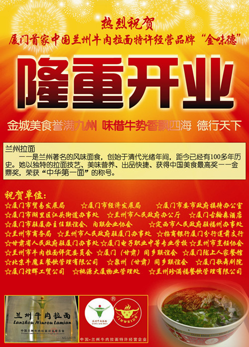 热烈祝贺福建厦门金味德餐饮管理有限公司暨金味德兰州牛肉拉面台湾街店五一开业大吉