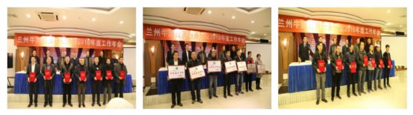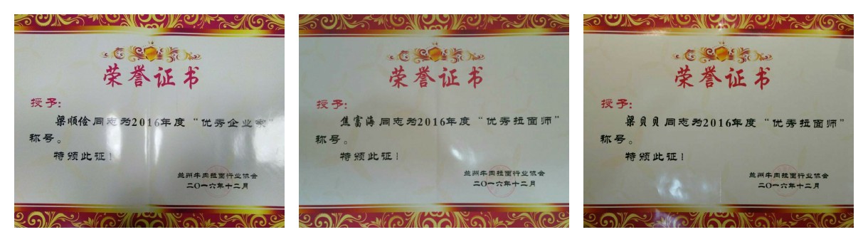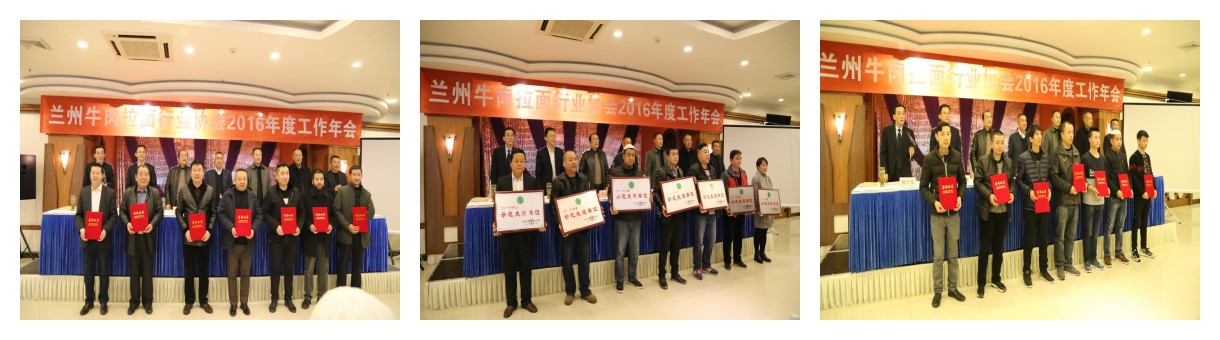 在年会上,评选出了一批示范先进单位、优秀企业家、优秀拉面师。甘肃金味餐饮有限公司、甘肃兴陇兰州牛肉拉面职业培训学校被评为2016年度示范先进单位,甘肃金味餐饮有限公司董事长梁顺俭被评为优秀企业家,金味德拉面师焦富海、梁贝贝被评为优秀拉面师。