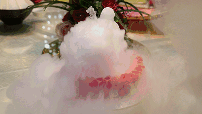 又如一尊皇牛的祥云刺身,点击率达到60%,不仅口感好,而且造型独特有多个版本,天鹅版是这样的:薄牛肉片放碎冰上叠成牡丹花状,旁边是天鹅冰雕和鲜花枝,当服务员把浇开水浇在冰块上,瞬间这道菜四周冒起了烟雾,像天鹅飞过雾气弥漫的湖面,非常梦幻。下图是神仙版:
