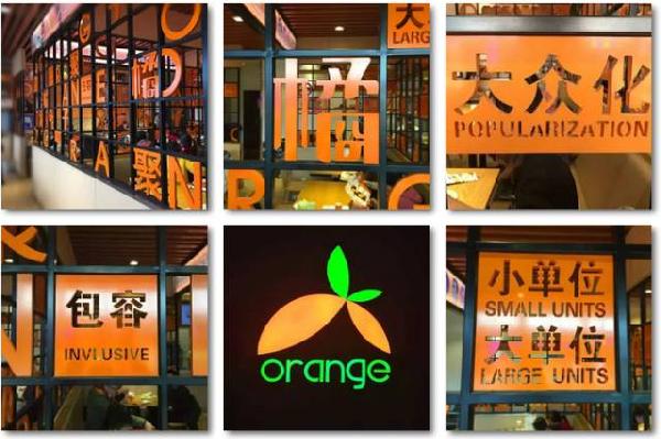 经过细致分析设计,并提出创意方案,设计师为“橘子”餐厅打造了一个以黑色背景为主题,绿色、橙色两种色彩构成简洁LOGO,“橘子”LOGO和背景色泽形成超级色彩反差,将“橘子”LOGO变成了店铺的超级标签。利用灯光加亮的效果,最后从商场的各个角度都能非常明显的看到“橘子”餐厅的LOGO,这一创意设计成功占领了消费者的眼光。