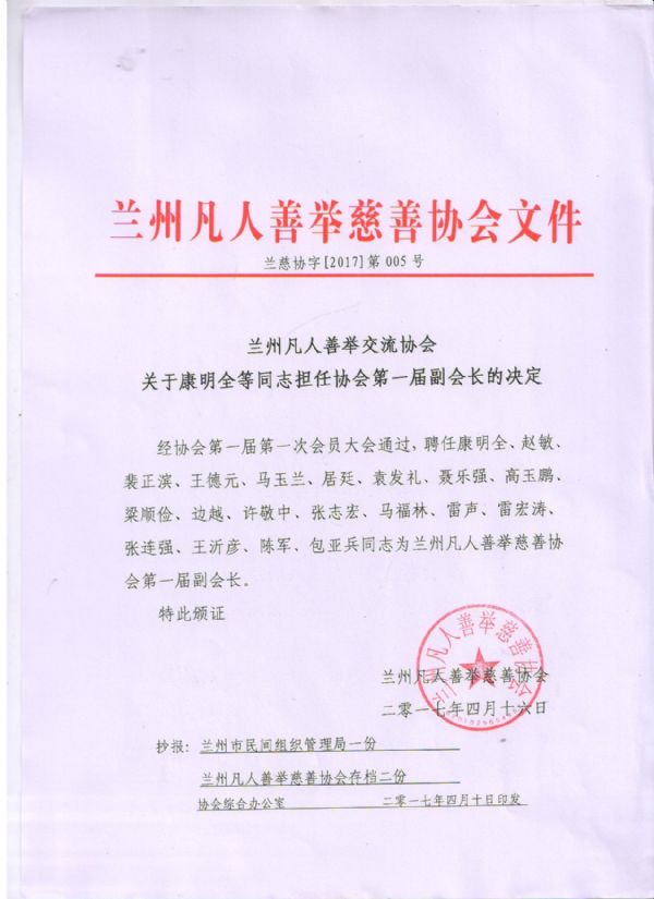 此次会议上,经协会第一届第一次会员大会通过,聘任康明全、赵敏、梁顺俭等20名同志为兰州凡人善举慈善协会第一届副会长。