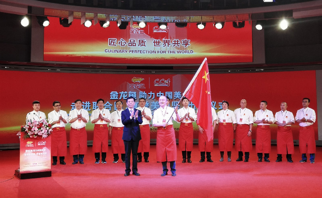 ▲中国烹饪协会会长姜俊贤向出征联合国的中国名厨团授旗