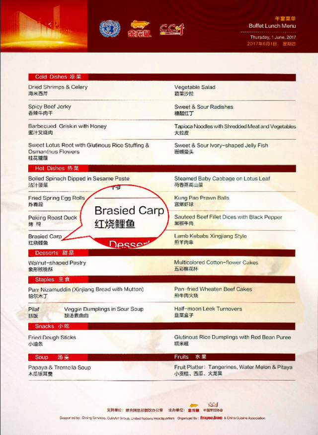 2017年6月1日,来自中国的顶级烹饪大师,在美国纽约联合国总部为300余位各国官员们烹制中国美食。本次宴会,河南特色招牌菜—— 红烧鲤鱼作为当天唯一鱼类菜肴入选。这也是鲤鱼继1949年10月1日,开国第一宴之后,第二次登上国际宴会的菜单。从河南,到联合国总部,这条鱼,游的好远。它终究实现梦想,跳出龙门,来到了联合国,让世界品尝中国的味道。
