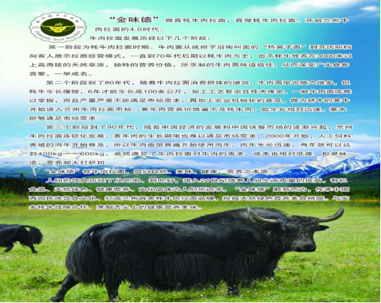 在继承传统兰州牛肉拉面风味的基础上、将面、肉、菜、汤、牛奶和鸡蛋有机的结合,配以金味德特质的牦牛肉清汤、解决现代人生活节凑快、经常使用快餐食品、缺乏全面营养的难题。金味德选用生活在海拔3000米以上、西北优美绝伦的天然草原——甘南玛曲地区的牦牛,吃的是中草药,喝的是矿泉水。其肉质是熬制牛肉汤的上品,佐以金味德专用肉汤料(配方中含二十多种对人体有益的中草药),经慢火煲制,金味德牛肉清汤具有汤鲜、味美、醇厚、营养丰富的品质,具有滋补、强身的功效,使面一上桌就香气四溢,味道纯美,使顾客食之如饴,久久回味。