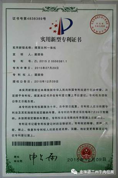 近年来,兰州牛肉面产业化发展被提上了日程,备受瞩目。然而,产业化发展,必须实现机械化。正当牛肉面人为之发愁的时候,中国烹饪大师、甘肃兴陇兰州牛肉拉面职业培训学校校长梁顺俭率先迈出了第一步,研究发明出了“兴陇”揉面出剂一体机,这是兰州拉面史上一次全新的尝试与改革,将极大推动兰州牛肉面的发展。