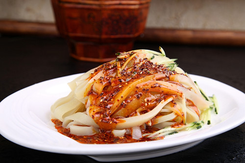 7、把凉皮放在盘子中,配上几片面筋,根据你的口味调上用油烧过的辣椒油, 浸过草果的香醋,温水调过的蒜泥,在加上些芝麻酱汁,精盐。