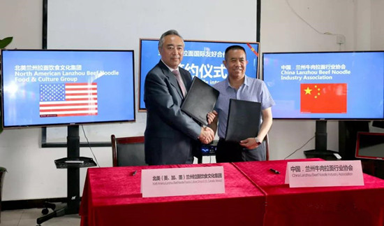 2018年,对于兰州牛肉拉面行业协会来说,是不同寻常的一年,2018年6月,美国南加州华人华侨商会会长、北美兰州拉面餐饮文化集团董事长应持荣同兰州牛肉拉面行业协会会长马利民签订国际友好合作协议,应持荣表示,“来兰州之前,专门调查过美国当地的消费者,发现他们都喜欢兰州牛肉拉面的口味。兰州牛肉拉面有100多年的历史,可以发掘非常多的故事。所以这次签约的内容之一就是成立研究院,对兰州牛肉拉面进行专题研究,并邀请好莱坞制作团队来兰,拍一部关于兰州牛肉拉面的宣传片,把兰州牛肉拉面悠久的历史、丰富的底蕴传播到北美地区。”