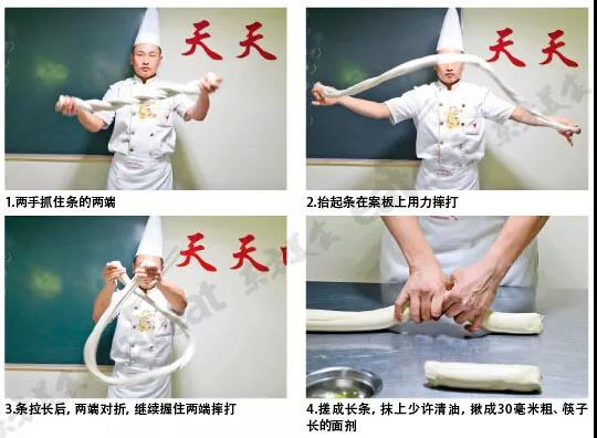 由膀圆力大的厨师将大团软面反复捣、揉、抻、摔后,将面团放在面板上,用两手抓住条的两端,抬起在案板上用力摔打。条拉长后,两端对折,继续握住两端摔打,如此反复,其目的是调整面团内部面筋蛋白质的排列顺序,使杂乱无章的蛋白质分子排列成一条长链,业内称其为顺筋、溜条。然后搓成长条,抹上少许清油,揪成30毫米粗、筷子长的一条条面剂,或搓成圆条。