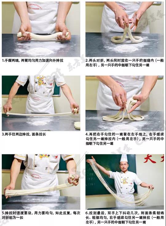 拉面是一手绝活,手握两端,两臂均匀用力加速向外抻拉,然后两头对折,两头同时放在一只手的指缝内(一般用左手),另一只手的中指朝下勾住另一端,手心上翻,使面条形成绞索状,同时两手往两边抻拉,面条拉长后,再把右手勾住的一端套在左手指上,右手继续勾住另一端抻拉。抻拉时速度要快,用力要均匀,如此反复,每次对折称为一扣。抻拉是一个技术性很强的工作,初学者很难掌握要领,同样的面团,在有经验的师傅手中,不但拉面的速度快(一般只需10秒钟左右),且拉出来的面条粗细均匀,不断裂,初学者可能不太容易做到。一个面节正好拉一大碗面,每拉一下,要在手腕上回折一次,拉到最后,双手上下抖动几次,则面条柔韧绵长,粗细均匀,一般大宽拉3扣,宽面拉4扣,二细拉5扣,细的拉6扣,毛细拉7扣,一窝丝拉8扣,条细如丝,且不断裂。