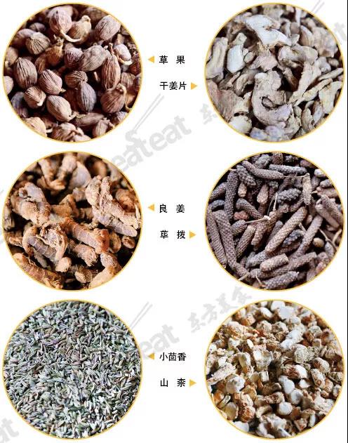 煮肉(汤)调料配比:花椒18%,干姜片20%,草果、肉桂各10%,山柰、肉蔻各5%,白胡椒9%,小茴香12%,香草、良姜各4%,荜拨3%,煮肉料比汤的投放比例根据口味浓淡大概为0.5%-0.7%。