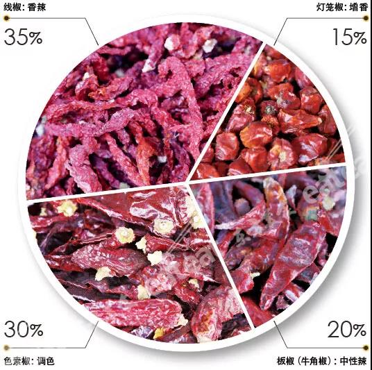 以北京地区的大部分食客口味为例子,线椒占35%,色素椒占30%,灯笼椒占15%,板椒占20%。