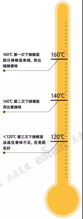 油与辣椒面的比例为20%(500克油加100克辣椒面);投放湿度较大的辣椒面油温控制在175℃,25千克以上可适量控制在165℃-170℃之间。