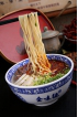 将溜好的面条放在案板上,撒上清油(以防止面条粘连),然后随食客的爱好,拉出大小粗细不同的面条,喜食圆面条的,可以选择粗、二细、三细、细、毛细5种款式;喜食扁面的,可以选择大宽、宽、韭叶3种款式;想吃出个棱角分明的,拉面师傅会为你拉一碗特别的"荞麦楞"。拉面是一手绝活,手握两端,两臂均匀用力加速向外抻拉,然后两头对折,两头同时放在一只手的指缝内(一般用左手),另一只手的中指朝下勾住另一端,手心上翻,使面条形成绞索状,同时两手往两边抻拉。面条拉长后,再把右手勾住的一端套在左手指上,右手继续勾住另一端抻拉。抻拉时速度要快,用力要均匀,如此反复,每次对折称为一扣。