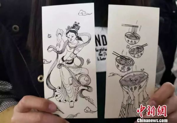 面条上漂着羊皮筏子、马踏飞燕空中有“面条云”、敦煌飞天披着面条做的彩带。甘肃政法学院艺术学院学生刘露露介绍,她和同学们一起将兰州牛肉面与本土文化相结合,创作出这些漫画,主要想通过这种方式,推广甘肃本土文化。