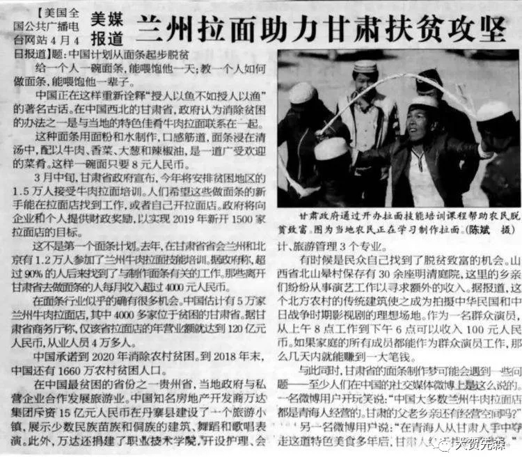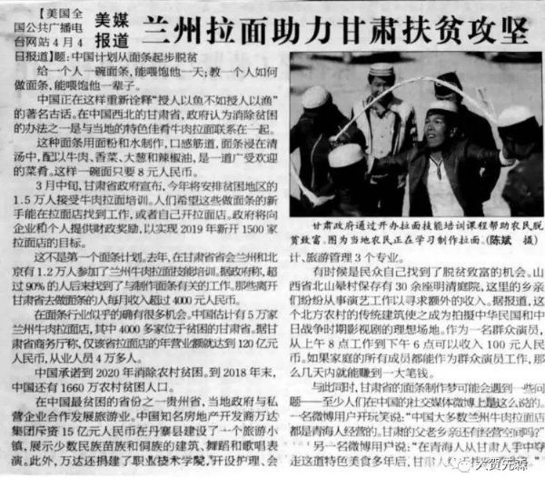 3月中旬,甘肃省政府宣布,今年将安排贫困地区的15万人接受牛肉拉面培训。人们希望这些做面条的新手能在拉面店找到工作,或者自己开拉面店。政府将向企业和个人提供财政奖励,以实现2019年新开1500家拉面店的目标。