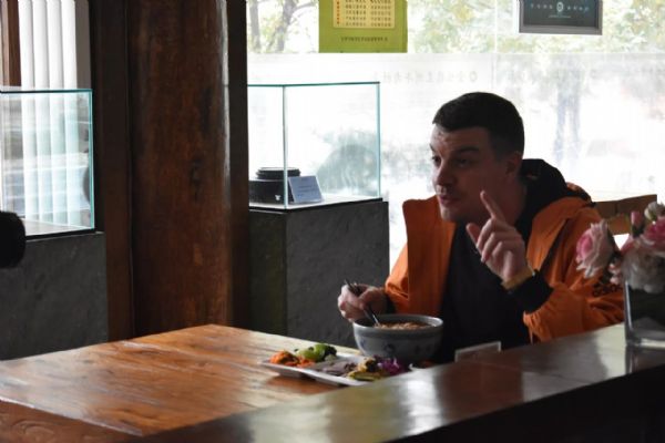 11月5日,人民日报记者、英国知名网红、中外文化体验者司徒建国和他的团队来到金味德拍摄兰州牛肉面。