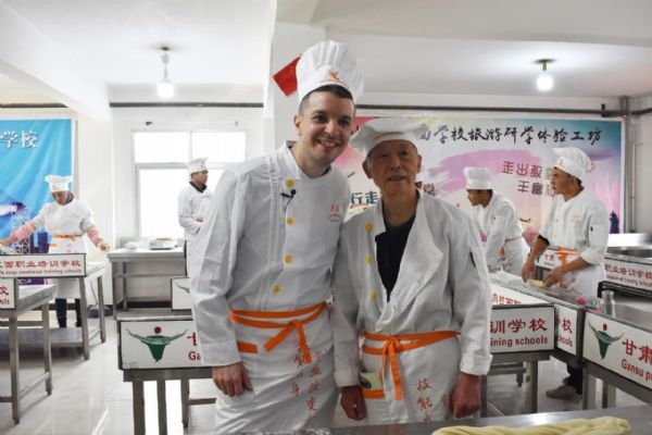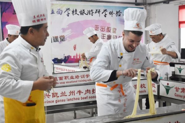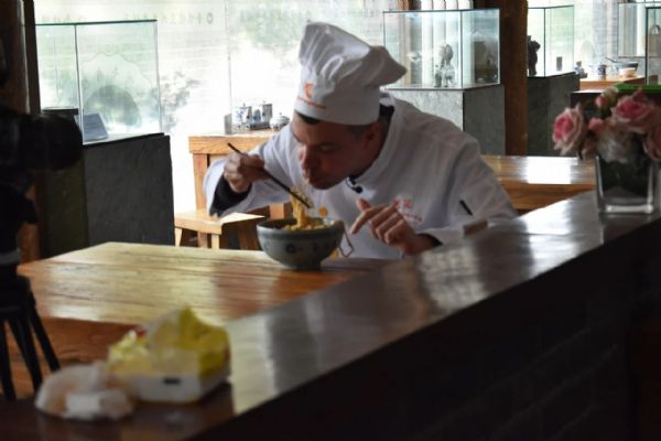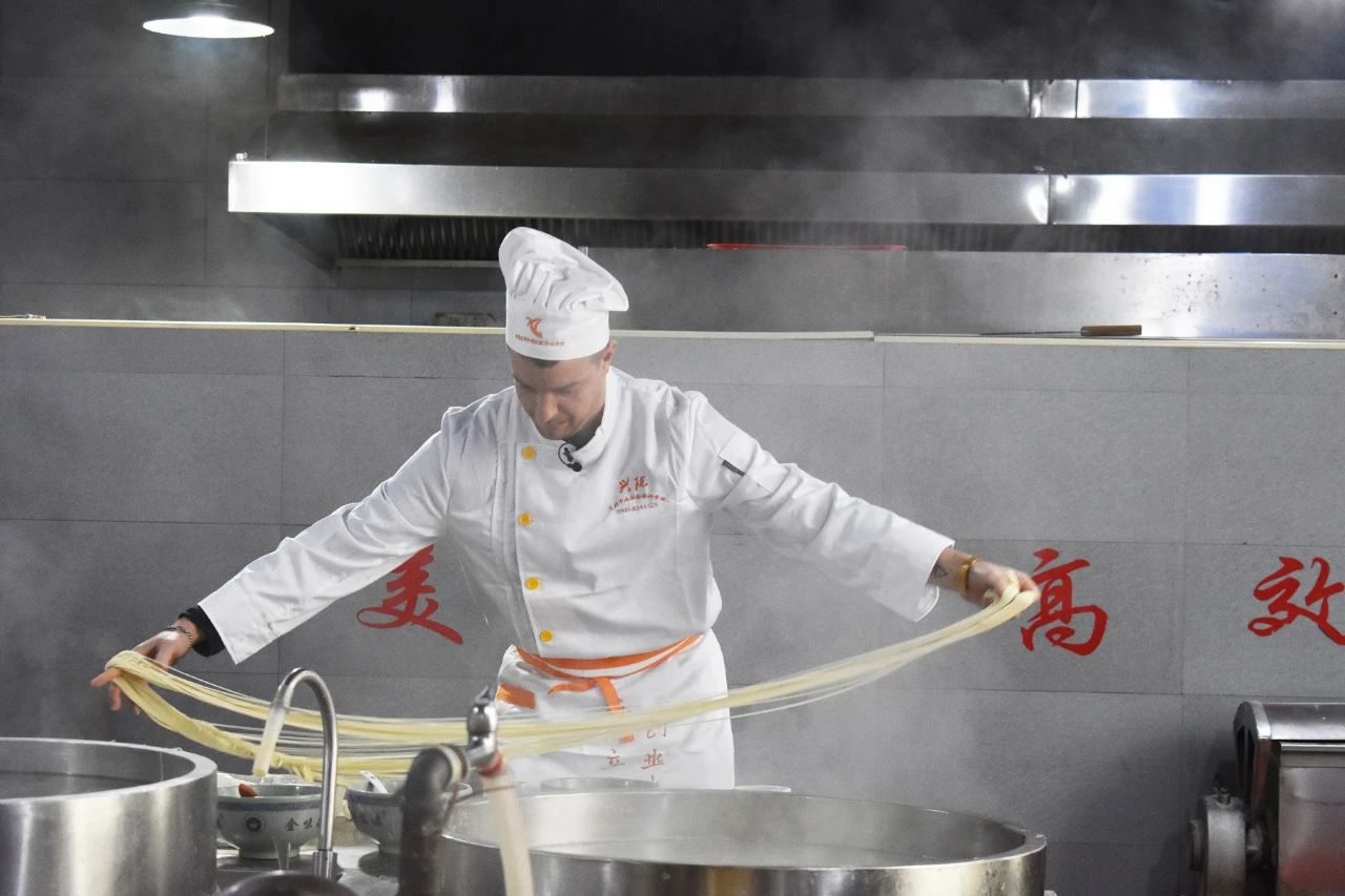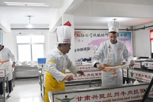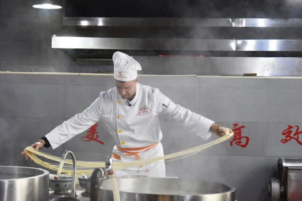 当日上午,司徒建国和团队首先来到金味德旗下的甘肃兴陇兰州牛肉拉面职业培训学校。他穿上厨师服,戴上厨师帽,走进培训室学拉面。学校的周老师一边给他讲解拉面技术,一边进行拉面展示。司徒建国认真地看着,英俊的脸上充满了惊奇。只见他细长的胳膊握着溜好的面条,慢慢地向两端抻拉,面条变长,两头对折时,发生“意外”。司徒建国不知道放到左手的什么位置,顿时慌了神。经过周老师不断的指导,他才勉强完成所有环节,拉好的面显得“与众不同”。培训室里还有其他学员练习拉面,司徒建国和他们互动。赵大爷是“大龄”学员,司徒建国用一口标准的普通话提问赵大爷,“您哪里人?”“您为啥来学拉面?”赵大爷热情地一一回答。下午,摄制团队又来到金味德兰州牛肉拉面体验工坊拍摄。司徒建国时而品尝牛肉面,时而讲解牛肉面文化,忙得不亦乐乎。而后,他亲自下厨做了一碗牛肉面。两相对比,更体现出金味德牛肉面的专业、精湛、可口。经过不断的讲解、多次的拍摄,司徒建国和他的团队终于完成了摄制任务。“兰州牛肉面真好吃,兰州牛肉面文化博大精深,我会好好宣传兰州牛肉面,让更多人来品尝,喜欢上兰州牛肉面。”司徒建国伸着大拇指坚定地说到。