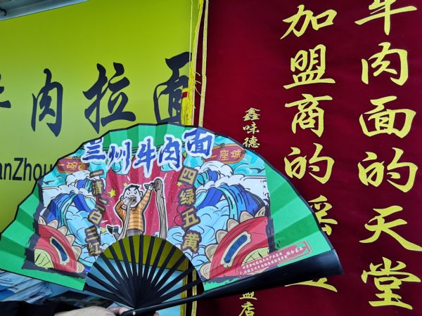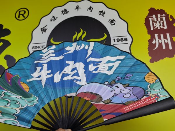 为推广兰州牛肉拉面,董事长梁顺俭给冯巩老师赠送了由甘肃金味德拉面文化产业集团和兴陇兰州拉面国际商学院联合出品的兰州拉面文创产品——扇子,冯巩老师在兰州登台演时出时,手持的就是那一把扇子。