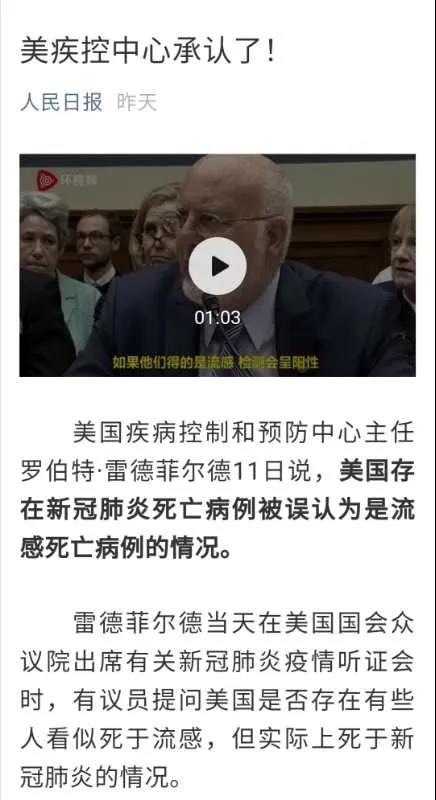 3月12日,@人民日报公众号发表了《美疾控中心承认了!》一文。