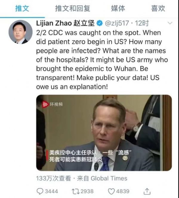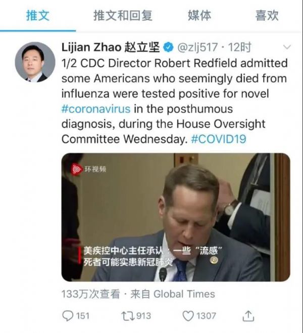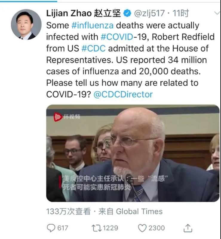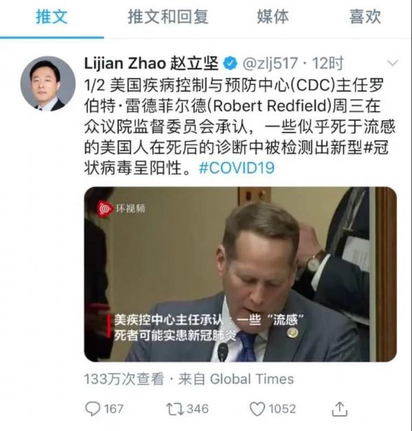 同日,外交部发言人赵立坚在推特上发文,对美国疾控中心主任承认美国有流感死者可能实患新冠肺炎一事进行了评论。