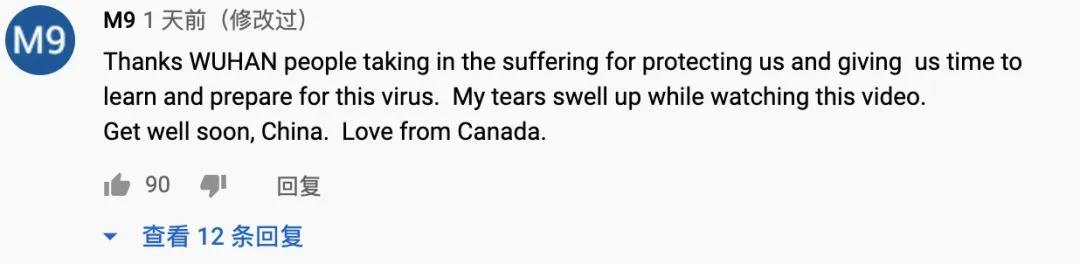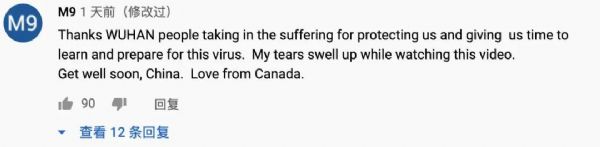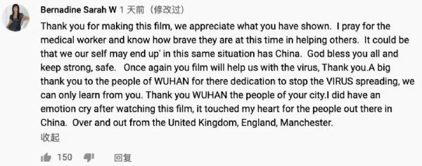 英国网友Bernadine Sarah W评论:“感谢这部纪录片,它为我们提供了抗击疫情的宝贵经验。非常感谢武汉人民用他们的献身精神阻止了病毒进一步传播。我们应该向他们学习。感谢武汉人民。”