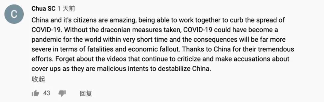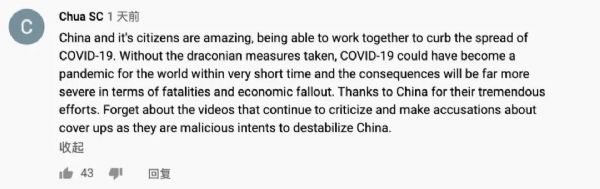“中国和中国人民真的很棒,能够团结起来防控疫情。如果不采取严厉的措施,新冠肺炎可能在很短的时间内成为世界性流行病,死亡人数和经济损失会更加严重。”网友Chua SC称赞道。