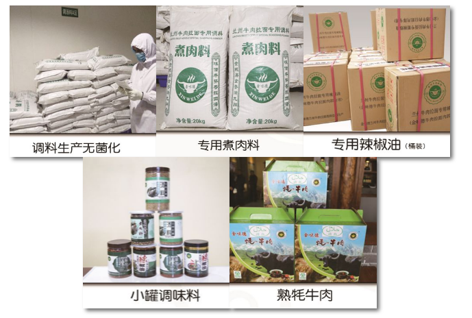 原辅材料生产、配送体系及新产品研发中心—兰州鑫味德牛肉面调味品有限公司,该公司位于甘肃省兰州市城关区鱼儿沟16号占地900平方米,“鑫味德”牌兰州牛肉拉面专用汤料、煮肉料、辣椒油,将各种调味料按比例进行了科学的搭配,攻破了兰州牛肉拉面发展百年以来一出兰州就变味的难题,并向国家商标局成功注册,有力的保证了产品质量、口感。年生产量在千吨,供应全国及国外的牛肉面店调料,带动当地员工就业近百人,创造效益近千万元。