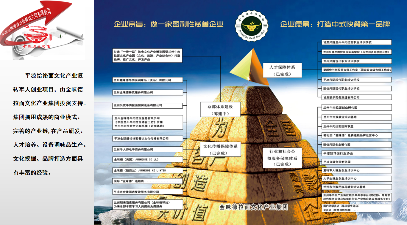 平凉饸饹面文化产业项目是甘肃金味德拉面文化产业集团投资打造的甘肃第二张面条新名片;是以崆峒养生道源文化为载体,以平凉饸饹面为龙头,挖掘宣传平凉饸饹面历史起源文化,结合多元化养生美食经营创新发展,是集平凉饸饹面文化推广、研学体验、标准化生产、新产品研发、技能培训、产业供应链信息化共享平台、平凉饸饹面品牌连锁加盟、厨房配套设备生产研发、劳务输出等功能为一体具有显著平凉地域特色的文化传播公司。形成完善平凉饸饹面文化、建设饸饹面产业供应链,打造“平凉饸饹面”品牌,将平凉创建成为《中国饸饹面之乡》。