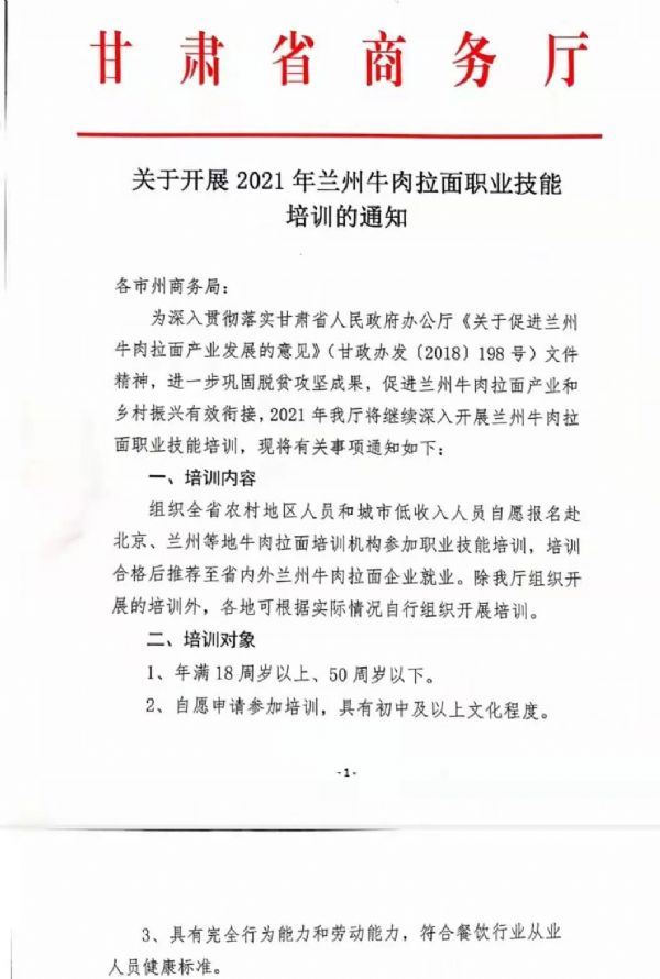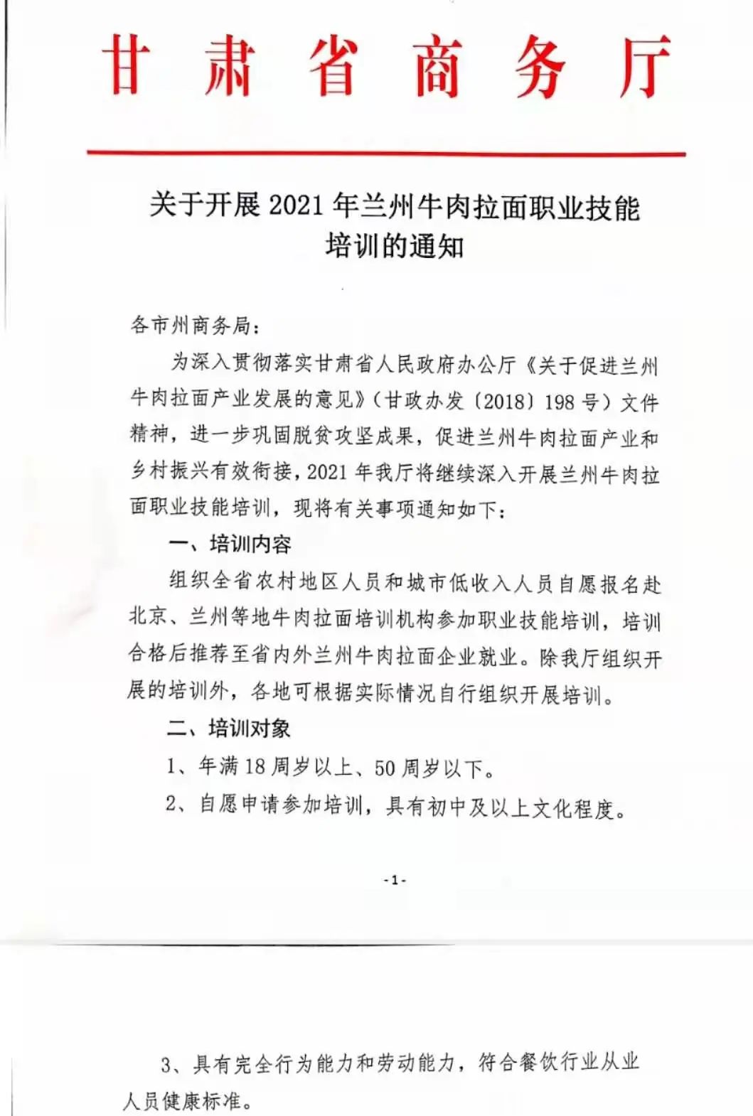为进一步巩固脱贫攻坚成果,促进兰州牛肉拉面产业和乡村振兴发展,2021年甘肃省商务厅联合中国兰州牛肉拉面培训基地—甘肃兴陇兰州牛肉拉面职业培训学校,面向全省继续深入免费开展兰州牛肉拉面职业技能培训。