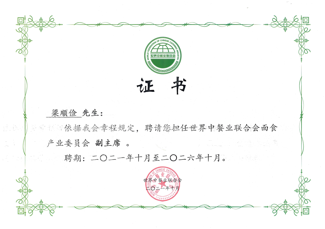 兰州牛肉拉面国际联盟主席、甘肃省烹饪协会副会长、兰州牛肉拉面行业协会副秘书长、兰州市人民对外友好协会副会长、平凉饸饹面行业协会会长、兰州烹饪协会副会长、兴陇兰州牛肉拉面国际商学院副院长、甘肃兴陇兰州牛肉拉面职业培训学校校长、《兰州牛肉拉面宝典》主编、金味德拉面文化产业集团董事长、兰州资源环境职业技术学院客座教授、兴陇兰州牛肉拉面国际商学院副院长、兰州金蓝领领军人才、梁顺俭兰州牛肉拉面大师工作室首席大师、兰州市旅游协会副会长,被世界中餐业联合会聘请为世界中餐业联合会面食专业委员会副主席,并被授予““面食产业大工匠”荣誉称号。