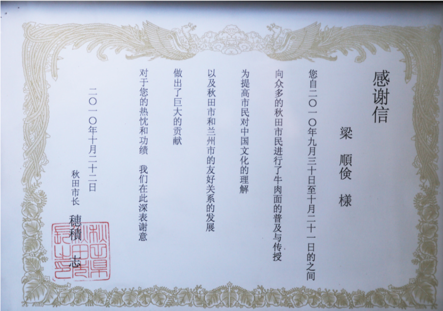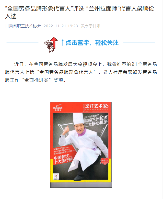 梁顺俭先生耕耘兰州拉面职业培训14年,累计面向国内外培训牛肉拉面人才达4万多人。长期致力于兰州牛肉拉面文化传播事业,先后于2009年、2010年两次担任兰州牛肉拉面文化技术交流大使赴日本交流传播饮食文化;2011年7月代表全国总工会在厦门参加海峡两岸职工论坛,2013年在美国华尔街交流兰州牛肉拉面文化。接待来自全国百强餐饮连锁企业代表、财政部、人社部、商务部等政府、全国行业协会考察团。