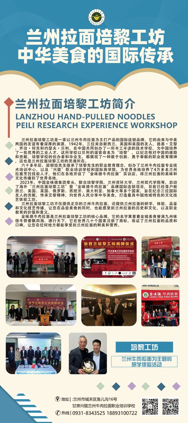 2023年5月8日,兰州资源环境职业技术大学联合培黎职业学院、金味德拉面文化产业集团和新西兰UUNZ学院在新西兰成立了首家以弘扬中国特色饮食文化的兰州牛肉拉面研学体验工坊——培黎工坊。这一创举不仅搭建起了中新文化交流的桥梁,更开启了中新职业教育国际合作交流的新篇章。